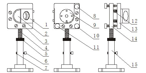 1.光靶放置架 2.反射镜 3.拉簧锁紧螺丝 4.调节螺杆 5.调节螺母 6.锁紧螺丝a7.锁紧螺丝b 8.调节螺丝M1 9.反射镜锁紧片 10.调节螺丝M 11.调节螺丝M2.12.拉簧 13.反射镜安装板 14.支撑板 15.底座.