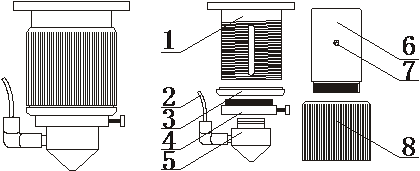 1.聚焦镜内筒 2.进气管 3.限位螺圈 4.气嘴过渡套5.气嘴 6.镜筒 7.限位螺丝 8.调节套筒.