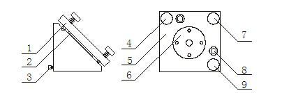 1.反射镜调整板 2.反射镜 3.锁紧螺丝 4.调节螺丝M1 5. 反射镜调整板6.反射镜压紧板 7.调节螺丝M 8.锁紧螺丝 9.调节螺丝M2